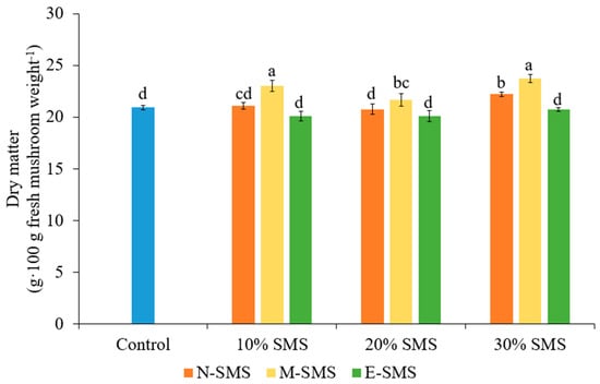 The dry matter of P. ostreatus fruiting bodies significantly varied among the studied substrates (Figure 4). The highest dry matter of P. ostreatus was observed in mushrooms grown on substrates supplemented with 30% M-SMS (23.74 g) and 10% M-SMS (23.06 g). There were no significant differences among 100% wheat straw-based substrate (control) and all studied supplementation rates of E-SMS and 10% N-SMS, in which the lowest P. ostreatus dry weight was observed.