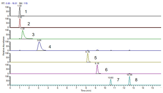 As shown in Table 3, the [M − G + H]+ and [M + H]+ characteristic ion fragments of desulphurization glucosinolates appeared in all glucosinolates under the impact of positive ion spray, while SIN did not detect this characteristic fragment in [M + Na]+. GRA and SIN did not detect this characteristic fragment in [M + K]+. The HPLC profile of glucosinolates in sixteen Chinese kale varieties indicate that eight glucosinolates were isolated and identified within 15 min, including four A-GLSs (GRA, SIN, GNA and GER) and four indolyl GLSs (4-HGBS, GBS, 4-MGBS and NGBS), and aromatic GLSs (R-GLSs) were not found in this experiment (Figure 2).