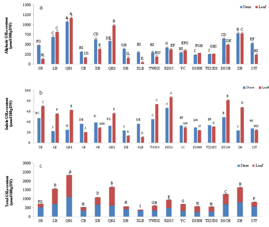 Accumulation of aliphatic, indole and total glucosinolates in stems and leaves of sixteen Chinese kale varieties. Different capital letters indicate extremely significant differences (p < 0.01). (a) Aliphatic glucosinolate content; (b) indole glucosinolate content; (c) total glucosinolate content.