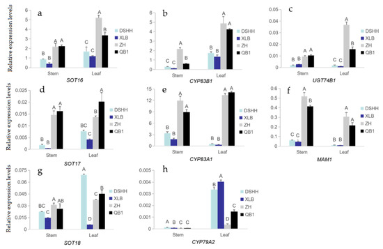 In the high glucosinolate varieties, the expression level of CYP83B1 in the stems of the ZH variety was significantly higher than that of QB1, but there was no significant difference in the leaves (Figure 4b). The expressions of UTG74B1 and SOT16 were not significantly different in the stems, while the expressions were significantly higher in the leaves of ZH than QB1 (Figure 4a,c). The expression of CYP79A2 in QB1 was also higher than in ZH (Figure 4h). A comparison of two low glucosinolate varieties DSHH and XLB indicates that the expression levels of SOT16, CYP83B1 and UTG74B1 had no significant differences in the stems and leaves, and the expression of CYP79A2 had no significant difference in the stems, but was significantly higher in the leaves of XLB than DSHH (Figure 4a–c,h).