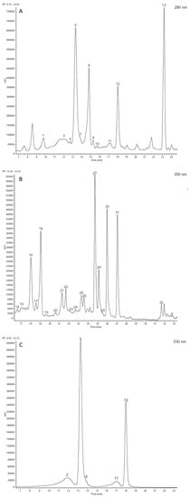 Phenolic chromatograms of strawberry fruit recorded at (A) 280 nm, (B) 350 nm and (C) 530 nm. Peak numbers are described in Table 3.