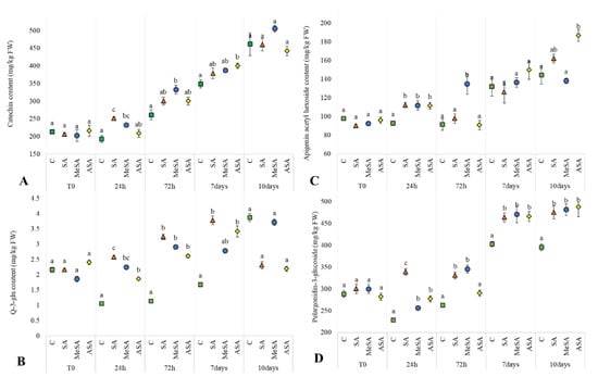 Content of catechin (A), quercetin-3-glucoside (B), apigenin acetyl hexoside (C) and pelargonidin-3-glucoside (D) (mg/kg FW) in C-control (◼), SA-salicylic acid (▲), MeSA-methyl salicylic acid (●) and ASA-acetyl salicylic acid (◆) treated strawberry fruits at different time points (T0, 24 h, 72 h, 7 days and 10 days after treatments). Different letters (ac) denote a significant difference between treatments (C, SA, MeSA and ASA), obtained with the Tukey test (p < 0.05). Data are presented as average value ± standard error (n = 15).