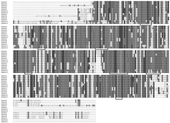 Amino acid sequence alignment of the PpyACSs. The seven conserved domains of the ACS isozymes are marked as red boxes. The seven highly conserved regions among all ACC synthases are underlined.