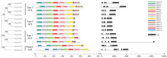 The exon-intron organizations and motifs of all PpyACS genes were examined in P. pyrifolia. As shown in Figure 2, 16 conserved motif sequences were detected (Table S4). All PpyACS contained motif 1~10. Motif 11 and 12 were only found in type I ACS, whereas motif 15 was unique to putative AAT genes. Motif 13 was found in type I and type III ACS. In four type II ACS genes, motif 14 was present in PpyACS1 and PpyACS5, whereas motif 16 only existed in PpyACS1 and PpyACS5. In general, the motifs are quite conserved within each type. In addition, the presence of a varying number and length of introns among the PpyACSs contribute to significant variations in gene length. The number of introns per PpyACSs also varied from two to five: the type III PpyACSs were characterized by two introns and the other PpyACSs displayed three to four introns except for PpyACS13, which contained five introns.