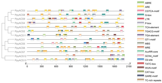 To further understand the transcriptional regulation and potential functions of PpyACS genes, the upstream promoter sequences of PpyACSs (2000 bp upstream of the start codon) were isolated and predicted (Figure 3). A number of cis-elements implicated in hormone and stress responses were found in the upstream sequences of these PpyACSs. MeJA responsiveness elements (TGACG-and CGTCA-motif) were present in all PpyACSs except PpyACS13. ABRE, ABA-responsive element was identified in most of the PpyACSs, except PpyACS4, PpyACS11 and PpyACS12. Three elements involved in gibberellin response, namely GARE-motif, TATC-box and P-box, were identified in all PpyACSs, except PpyACS7. Auxin-responsive elements (AuxRR-core and TGA-element) were found in most of the PpyACSs, except PpyACS6, PpyACS7, PpyACS8 and PpyACS11. We also noticed that cis-elements associated with abiotic stress response were widely distributed within the promoters of PpyACSs. For example, an element essential for the anaerobic induction, named ARE, was identified in the PpyACSs, except PpyACS6 and PpyACS12. A low temperature-responsive element (LTR) was identified in PpyACS1, PpyACS3, PpyACS9 and PpyACS10, whereas TC-rich repeats involved in defense response were observed in PpyACS1 and PpyACS2. Meanwhile, a MYB transcription factor binding site (MBS) involved in drought stress response was present in four members, including PpyACS2, PpyACS7, PpyACS10 and PpyACS11. In addition, a wound-responsive element (WUN motif) was found in PpyACS5, PpyACS9 and PpyACS11.