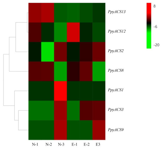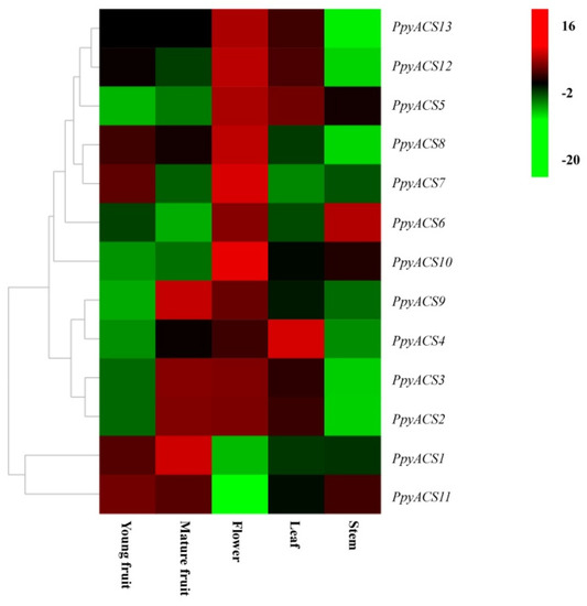 The qRT-PCR analysis showed that PpyACS genes were differentially expressed in different tissues. Among 13 PpyACS genes, PpyACS1, PpyACS2, PpyACS3 and PpyACS9 were expressed highly in mature fruits. The other nine PpyACS genes were expressed in the remaining studied tissues/organs, such as PpyACS4 and PpyACS5, which were highly expressed in the leaf, while PpyACS5, PpyACS7, PpyACS8, PpyACS10, PpyACS12 and PpyACS13 in flowers (Figure 5).
