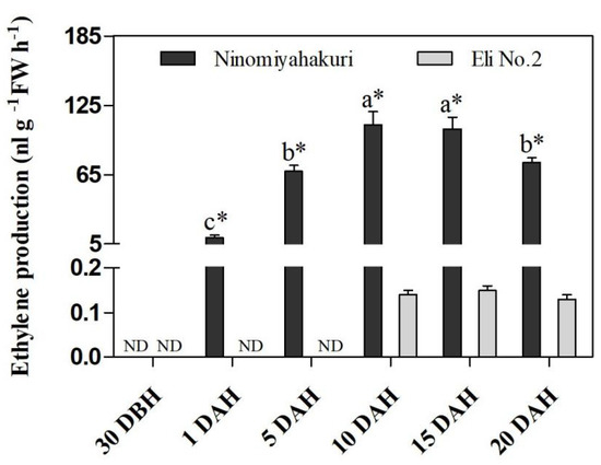 The ethylene production of fruits in ripening period of ‘Ninomiyahakuri’ and ‘Eli No. 2’ fruits. DBH: day before harvest. DAH: day after harvest. ND: None detected. ‘*’ in each graph indicates a significant difference between ‘Ninomiyahakuri’ and ‘Eli No. 2’ cultivar (t-test, n = 3, p < 0.05). Different lower-case letters indicate significant differences among time points in the same cultivar (Duncan-test, n = 3, p < 0.05).