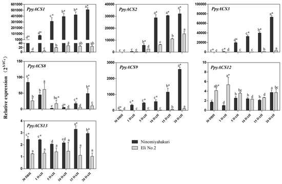 Comparison of PpyACS1, PpyACS2, PpyACS3, PpyACS8, PpyACS9, PpyACS12 and PpyACS13 expression levels between ‘Ninomiyahakuri’ and ‘Eli No.2’ fruits at different ripening stages. DBH: day before harvest. DAH: day after harvest. ‘*’ Each graph indicates a significant difference between ‘Ninomiyahakuri’ and ‘Eli No. 2’ cultivar (t-test, n = 3, p < 0.05). Different lower-case letters indicate significant differences between time points in the same cultivar (Duncan-test, n = 3, p < 0.05).