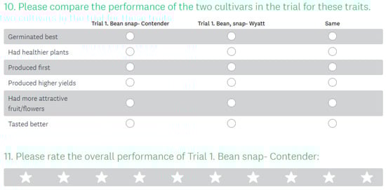Example question block from online evaluation form illustrating the comparison of the performance of the two trial cultivars in the 2021 snap bean trial.