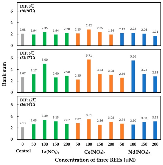 After summing all of the growth parameters with the different treatments for the new D. aphyllum shoots, the average rank sum of all treatments in DIF6 was the highest (3.44), followed by that of DIF12 (2.88) and DIF0 (2.15) (Figure 1). There were no significant differences among the three REE treatments. The mean rank sum of all treatments with Ce(NO₃)₃ was the greatest (2.96), followed by that of La(NO₃)₃ (2.83), and Nd(NO₃)₃ (2.82). All treatments had a higher rank sum than that of the control group (2.29). A comparison of the four REE concentrations showed that all treatments with 100 μM had the highest rank sum (3.68), followed in order by 150 μM (2.68), 200 μM (2.61), and 50 μM (2.49). They were also all higher than the rank sum of the control group (2.29). Among all the treatments, 100Ce in DIF6 achieved the highest rank sum (5.71), followed by 100Nd (5.56) and 100La (5.00) in the same DIF treatment. The lowest rank sum was observed with 200Nd in DIF0 (1.71).