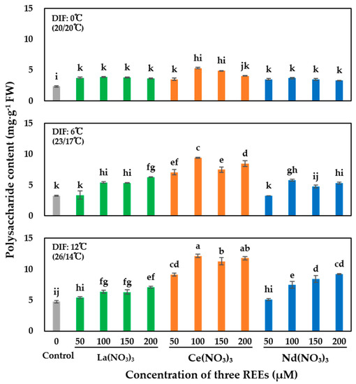 The highest polysaccharide content was observed with 100Ce in DIF12, which was not significantly different from that with the 200Ce treatment in the same DIF but was significantly higher than that of all other treatments (Figure 3). In general, the polysaccharide content increased significantly with the increase in DIF, and the average polysaccharide content with DIF0, 6 and 12 was 3.77, 5.78 and 8.02 mg·g−1, respectively. DIF6 and DIF12 resulted in a polysaccharide content increase of 54% and 113%, respectively, compared to that with DIF0. The average polysaccharide content with La(NO₃)₃ (5.04 mg·g−1) and Nd(NO₃)₃ (5.27 mg·g−1) was not significantly different, but the polysaccharide content with Ce(NO₃)₃ (7.87mg·g−1) was significantly higher than that with the other treatments; the lowest was observed in the control group (3.44 mg·g−1). The polysaccharide content in 100, 150, and 200 μM treatments was 6.59, 6.19, and 6.57 mg·g−1, respectively. The 50 μM treatment led to a relatively low polysaccharide content at 4.89 mg·g−1.