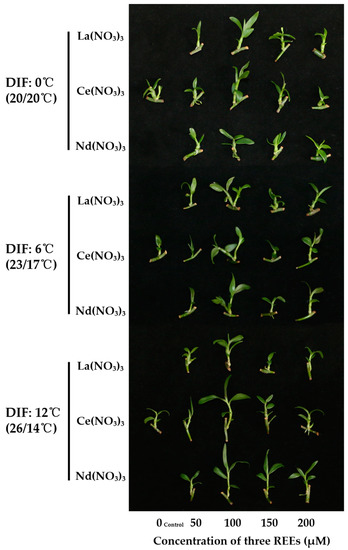 Morphological observations are presented in Figure 4. In general, D. aphyllum grown with DIF6 had the greatest number of shoots and the highest plant quality, especially when 100 μM REE was added. The number of new shoots in DIF0 and DIF12 was relatively lower, and in DIF12 the plants were visibly thinner and more slender. It appears that the different REE types had no significant effects on the morphology, but there were significant differences in response to the different REE concentrations. The biomass and growth of D. aphyllum in all 100 μM treatments were higher than those in the other treatments.