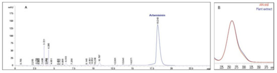 AN content was analysed in A. annua samples from seedlings and in vitro grown RPs. Figure 2 shows the HPLC chromatograms of A. annua extracts (Figure 2a) and spectra of AN standard in comparison with the putative AN peaks from plant extracts (Figure 2b).