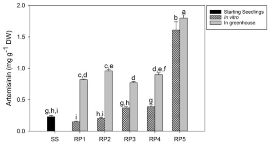 3.3. Evaluation of Artemisinin and Precursors in Seedlings and RPs