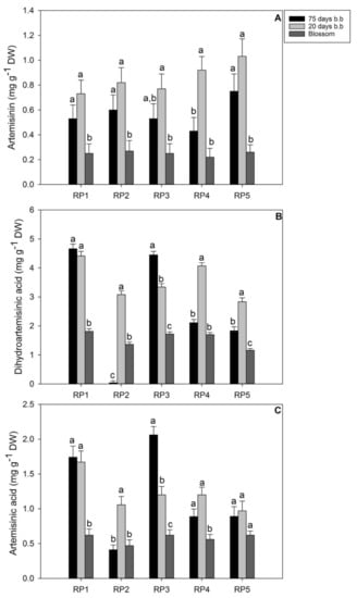 Artemisinin (A), Dihydroartemisinic acid (B) and Artemisinic acid (C) content in Artemisia annua regenerated plants (RPs) at different sampling times (b.b. = before blossom). Data are expressed as mg g−1 DW and are means ± standard deviation of two independent replicates (n = 2). Data were submitted to one-way analysis of variance (ANOVA). Differences in the same groups were detected using multiple comparison procedures (Tukey test) and indicated with different letters.