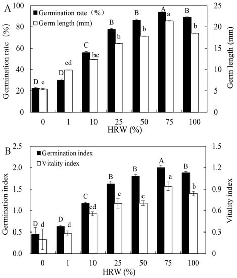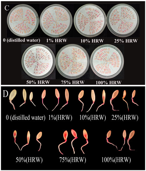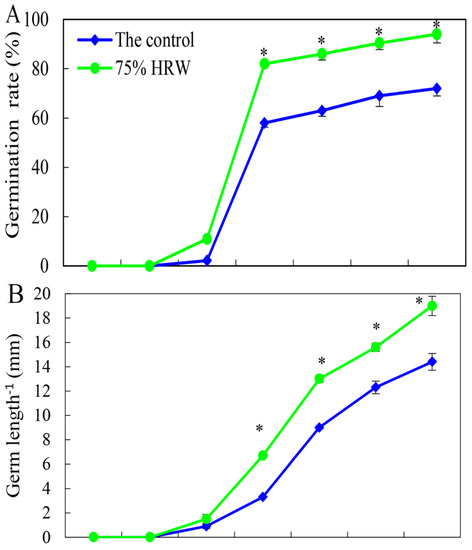 Similar to the germination rate, Figure 2B illustrates an increasing trend of the germ length throughout the test period, especially from 8 to 12 h. Moreover, the germ length of seeds treated with 75% HRW significantly increased from 12 to 48 h and reached the maximum value at 48 h.