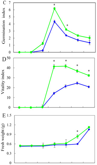 In addition, the germination index (GI) was calculated according to GI =∑ (Gt/Tt), where Gt is the number of the germinated seeds in the hour. The seed vitality index (VI) was determined according to the formula VI = GI × seedling dry weight [38].