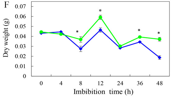 Changes in germination rate (A), germ length (B), germination index (C), vitality index (D), fresh weight (E), and dry weight (F) in cucumber with or without 75% HRW treatment during imbibition at 0, 4, 8, 12, 24, 36, and 48 h. The values (mean ± standard error (SE)) are the average of three independent experiments (n = 3). The asterisks denote Turkey–Kramer′s t-test significance under different treatments at the same time: * p < 0.05, h: hours, HRW: hydrogen-rich water.