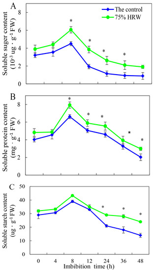 More soluble sugar, protein, and starch were accumulated in seeds treated with 75% HRW than in the control seeds (Figure 3). The soluble sugar content in the control and seeds treated with 75% HRW initially increased and then decreased, attaining the maximum at 8 h (Figure 3A). The soluble sugar contents with and without 75% HRW treatment declined after 8 h, and a significant difference was observed between the control and seeds treated with 75% HRW from 8 to 48 h (Figure 3A). Similar to the soluble sugar, the tendency of soluble protein increased first and then decreased, obtaining the maximum at 8 h (Figure 3B). Significant difference was observed between the control and seeds treated with 75% HRW from 8 to 48 h (Figure 3B). The soluble starch content remained at a steady level in all treatment groups from 0 to 8 h, after which it declined (Figure 3C). By contrast, from 24 to 48 h, the starch content was higher in the control than in seeds treated with 75% HRW (Figure 3C). Therefore, the contents of soluble sugar, soluble protein, and starch were increased by 75% HRW treatment, which might promote seed germination.