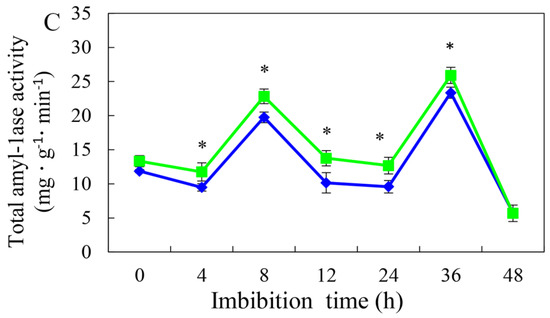 The activities of α- and β-amylase and total amylase in cucumber seeds were analyzed by a amylase determination kit (Beijing Biolab Technology Co., Ltd., Beijing, China) according to the manufacturer′s instructions. Samples (0.1 g) were ground and extracted in 1 mL of distilled water. The homogenate was constant kept for 10 min, then shaken and extracted sufficiently at room temperature. The homogenate was then centrifuged at 3000× g at 25 °C for 10 min. The supernatant was made up to the volume of 10 mL by adding distilled water and mixed evenly to be used as the amylase stock solution. The activities of α- and β-amylase and total amylase were measured according to Table 1. Their activities were calculated by following the formulas: