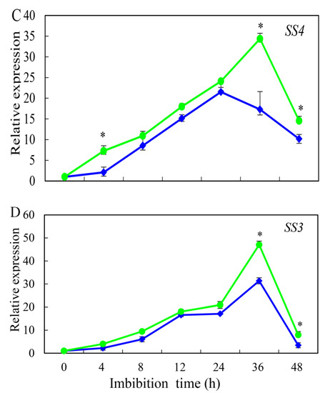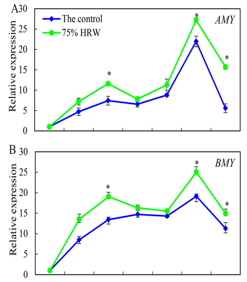 3.5. Effect of HRW on AMY, BMY, SS3, and SS4 Gene Expression during Germination