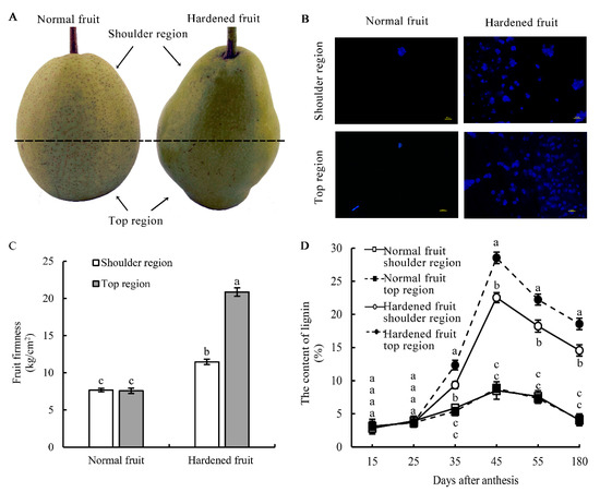 Lignin accumulation in the ‘Suli’ pear fruit. (A) The phenotypes of ‘Suli’ pear NFs and HFs during the ripening period. (B) Observation of stone cells in NFs and HFs using fluorescence microscopy. Bar = 100 μm. (C) Fruit firmness in the top and shoulder regions of NFs and HFs. (D) Time courses of lignin accumulation at different fruit development stages. Three independent replicates consisting of 10–15 fruits each were collected for each sample. Small letters stand for significant differences (p = 0.05).