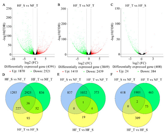 The analysis of DEGs was implemented to reveal the potential mechanisms by which lignin differentially accumulates in pairs of samples (HF_S vs. NF_T, HF_T vs. NF_T, HF_T vs. HF_S). The expression levels of DEGs were measured as Fragments Per Kilobase of transcript per Million mapped (FPKM) reads values, followed by identification and filteration on the basis of criteria as follows: FDR < 0.05 and an |log2| ≥ 1. After screening, we identified 4391 (1870 upregulated and 2521 downregulated), 3849 (1410 rose and 2439 dropped) and 408 (24 rose and 384 dropped) DEGs for HF_S vs. NF_T, HF_T vs. NF_T and HF_T vs. HF_S, respectively (Figure 2A–C, Table S4). There were 93, 1203 and 836 DEGs detected independently in each compared group, denoting the involvement of these genes in the particular physiological process in HFs (Figure 2D–F, Table S4). 36 DEGs were common in all the compared samples, five of which participating in phenylpropanoid biosynthesis were determined.