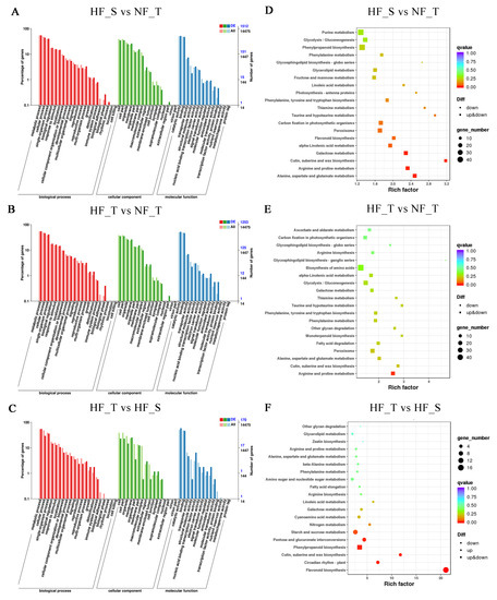 Division of DEGs in light of function. (A–C) GO categories assigned to differentially expressed genes in HF_S vs. NF_T (A), HF_T vs. NF_T (B) and HF_T vs. HF_S (C), respectively. (D–F) KEGG pathways of DEGs in HF_S vs. NF_T (D), HF_T vs. NF_T (E) and HF_T vs. HF_S (F), respectively. Three independent replicates consisting of 10–15 fruits each were collected for each sample. (NF_T: normal fruit top region, HF_S: hardended fruit shoulder region, HF_T: hardended fruit top region).