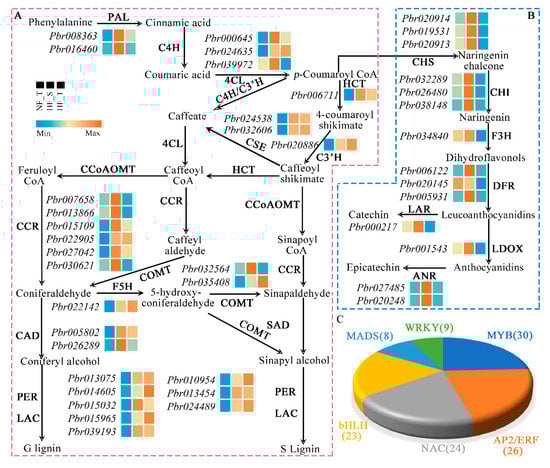 Lignin is a phenylpropanoid pathway-derived secondary metabolite playing a role in plants [11]. Phenylalanine ammonia-lyase (PAL), 4-coumarate: coenzyme A ligase (4CL) and cinnamic acid 4-hydroxylase (C4H) catalyse phenylpropanoid biosynthesis. Caffeoyl shikimate esterase (CSE), Hydroxycinnamoyl-CoA: shikimate hydroxycinnamoyl transferase (HCT), p-coumaroyl shikimate 3′-hydroxylase (C3′H), caffeoyl CoA O-methyltransferase (CCoAMT), cinnamoyl-CoA reductase (CCR), caffeic acid 3-O-methyltransferase (COMT), ferulate 5-hydroxylase (F5H), cinnamyl alcohol dehydrogenase (CAD), peroxidase (PER) and laccase (LAC) are major enzymes controlling the lignin biosynthesis [12,13]. In pear fruit, stone cell growth relies in the biosynthesis of two types of lignin, namely, guaiacyl lignin (G-lignin) and syringyl lignin (S-lignin) [14,15]. For different pear varieties and developmental stages, structural genes were identified as hub genes involved in the lignin pathway [16,17,18,19,20], Table S1. Pears are rich in various lignin biosynthesis genes since the expansion of lignin synthesis gene family contributes to the large accumulation of lignin [21].