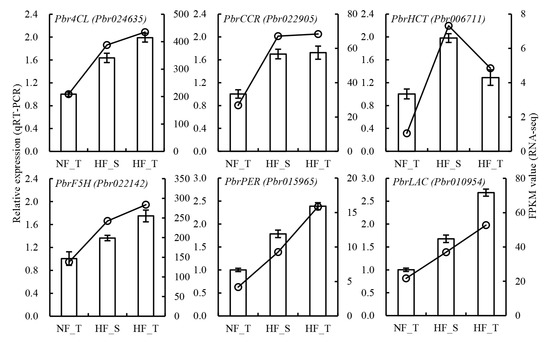 Generally, there is interrelationship between lignin biosynthesis and the phenylpropanoid metabolism pathway. It was revealed by the evaluation of RNA-seq data that some notable enzyme genes presented active transcription and expression in the phenylpropanoid metabolism pathway, and they were identify to regulate the entry of carbon sources for lignin biosynthesis, including PbrPAL (2), Pbr4CL (3), PbrHCT (1), PbrCOMT (2), PbrF5H (1), PbrCCR (6), PbrCAD (2), PbrC3H (1), PbrCES (2), PbrPER (3) and PbrLAC (3) (Figure 4A, Table S7). The expression levels of these notable enzyme genes in the lignin biosynthetic pathway were measured in view of the findings in transcriptome sequencing. In the NF_T group, the most important lignin biosynthesis enzyme genes wer elowly expressed; these notable enzyme genes in the lignin biosynthetic pathway showed an upregulation trend in at least one region of HFs.