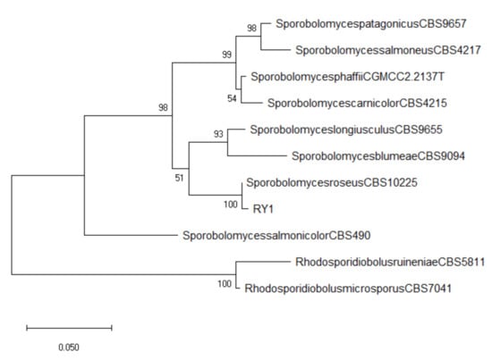 Phylogenetic tree based on the ITS sequences of reference strains of Sporobolomyces spp. plus the isolate RY1 from this study. Numbers on nodes represent the maximum likelihood bootstrap percentages. Branch lengths are proportional to the number of nucleotide substitutions and measured using the bar scale (0.050). Type strains are indicated with a T.