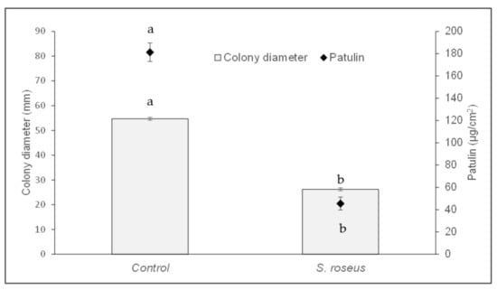 Effect of Sporobolomyces roseus on Penicillium expansum colony diameter (mm) and patulin production (µg/cm2). Data are the mean of three replicates ± standard error of the mean (SEM). For each parameter, bars with different letters are statistically significant (p ≤ 0.05) according to Duncan’s Multiple Range Test (DMRT).