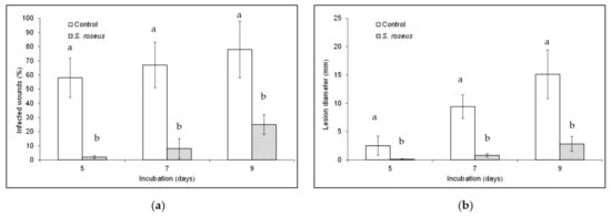 Sporobolomyces roseus effect on blue mold incidence (a) and severity (b) on Golden Delicious apples. Fruit were wounded, yeast-treated, pathogen-inoculated, and stored at 20 ± 1 °C for 9 days in the dark and high relative humidity. Data are the mean of three replicates ± standard error of the mean (SEM). Bars with different letters are statistically significant (p ≤ 0.05) according to Duncan’s Multiple Range Test (DMRT).
