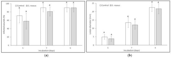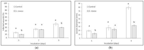 Concerning the in vivo assay on Golden Delicious apple, once applied into wounds, S. roseus reduced disease incidence up to 96% (Figure 3A) and the reduction remained significant for all the incubation period (9 days); similarly, a reduction of disease severity up to 98% (Figure 3B) was observed in presence of S. roseus, which remained significant for the 9 days of the monitoring.