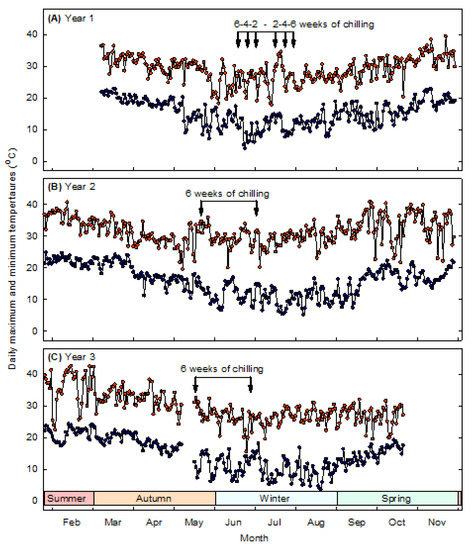 Daily maximum and minimum temperatures experienced by peony plants in the tunnel house in (A) Year 1, (B) Year 2, and (C) Year 3 of the study. Arrows indicate the start and finish of 2, 4 or 6 weeks of chilling at 4 °C in Year 1, and 6 weeks of chilling at 4 °C in Years 2 and 3.