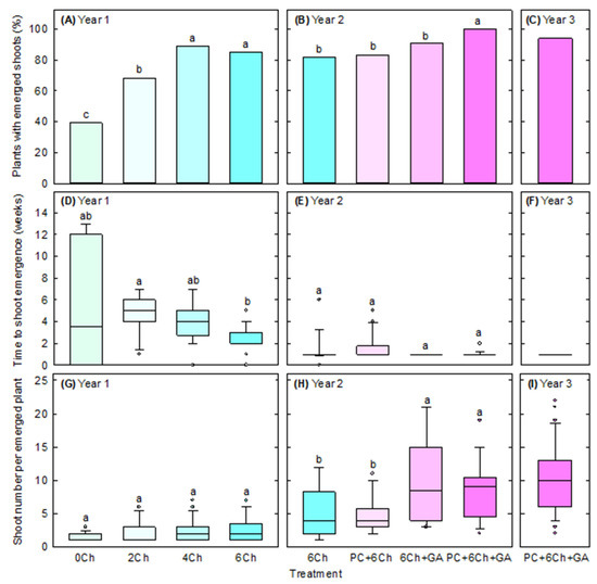 Percentage of peony plants with emerged shoots in (A) Year 1, (B) Year 2 and (C) Year 3; the time after chilling to first shoot emergence in (D) Year 1, (E) Year 2 and (F) Year 3; and the number of shoots per emerged plant in (G) Year 1, (H) Year 2 and (I) Year 3. ‘0Ch’, ‘2Ch’, ‘4Ch’ and ‘6Ch’ = 0, 2, 4 or 6 weeks of chilling at 4 °C, respectively; ‘PC’ = pre-treatment from 20 °C to 8 °C prior to chilling; ‘GA’ = GA3 treatment after chilling. Means are presented in (A–C); medians (D–I) are presented with 25th and 75th percentiles (boxes), 10th and 90th percentiles (whiskers), and outliers (circles). Means or medians in the same year with different letters are significantly different (Binomial tests with Holm–Šidák corrections, or Kruskal–Wallis and Dunn’s tests with Bonferroni corrections; p < 0.05, n = 18–65).