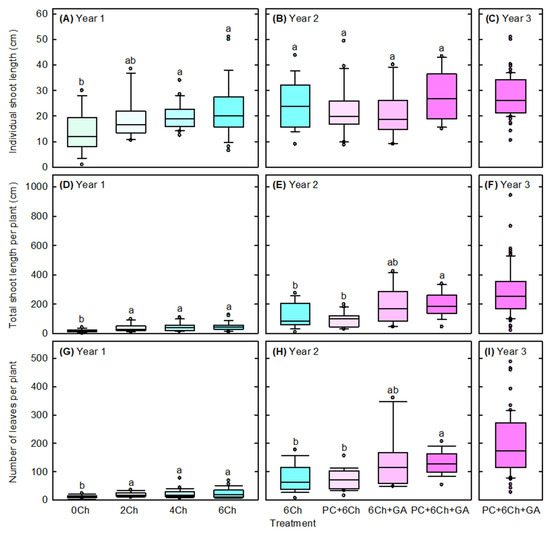 Length of individual shoots on peony plants in (A) Year 1, (B) Year 2 and (C) Year 3; the total length of shoots per plant in (D) Year 1, (E) Year 2 and (F) Year 3; and the number of leaves per plant in (G) Year 1, (H) Year 2 and (I) Year 3. ‘0Ch’, ‘2Ch’, ‘4Ch’ and ‘6Ch’ = 0, 2, 4 or 6 weeks of chilling at 4 °C, respectively; ‘PC’ = pre-treatment from 20 °C to 8 °C prior to chilling; ‘GA’ = GA3 treatment after chilling. Medians are presented with 25th and 75th percentiles (boxes), 10th and 90th percentiles (whiskers), and outliers (circles). Medians in the same year with different letters are significantly different (Kruskal–Wallis and Dunn’s tests with Bonferroni corrections; p < 0.05, n = 18–65).