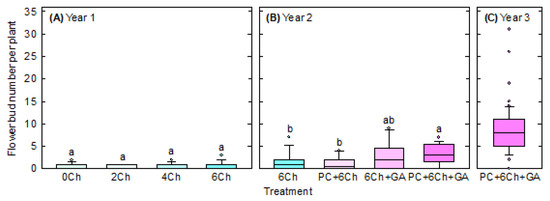 Number of flower buds per peony plant in (A) Year 1, (B) Year 2 and (C) Year 3. ‘0Ch’, ‘2Ch’, ‘4Ch’ and ‘6Ch’ = 0, 2, 4 or 6 weeks of chilling at 4 °C, respectively; ‘PC’ = pre-treatment from 20 °C to 8 °C prior to chilling; ‘GA’ = GA3 treatment after chilling. Medians are presented with 25th and 75th percentiles (boxes), 10th and 90th percentiles (whiskers), and outliers (circles). Medians in the same year with different letters are significantly different (Kruskal–Wallis and Dunn’s tests with Bonferroni corrections; p < 0.05, n = 18–65).