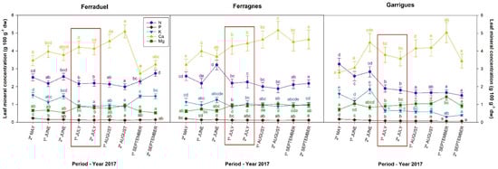The evolution of the concentration of macronutrients at different leaf collecting dates in the Ferraduel, Ferragnes, and Garrigues varieties. The red square indicates the simultaneous period of greater stability in the five nutrients. Values are the average ± standard error (n = 12). For every cultivar and nutrient, the different lowercase letters indicate significant differences between the sampling date for p < 0.001 established by Tukey’s multiple range test.