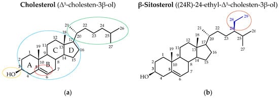 Sterols are considered lipids by nature because of their relatively large, mostly nonpolar, and thus hydrophobic molecular structure, with only a single functional polar hydroxyl group. Because of the hydroxyl group, they are alcohols; because of the isoprene-based structure, they belong to the group of triterpenes (terpenes with 30 carbon atoms); and owing to a specific structure with characteristic four rings and an aliphatic chain, they belong to steroids [,,]. Plant sterols are formed in a unique biosynthetic pathway in which 4,4′-dimethylsterols and 4-methylsterols serve as precursors to 4-desmethylsterols. Thus, these three groups of compounds are characterized by certain common structural specificities. The basic structure of plant sterols with β-sitosterol as the main representative resembles that of cholesterol and is characterized by the following (Figure 1): (I) the basic skeleton that consists of four condensed non-aromatic rings, of which three rings with six carbon atoms and one ring with five carbon atoms; (II) a hydroxyl group on the carbon atom at position 3 (C3) in ring A; (III) a double bond at positions 5 and/or 7 in ring B; and (IV) a side alkyl chain at position 17 in ring D, which may contain an ethyl/methyl/ethylidene/methylene group attached to C24 in the molecule. Hydrogenated (saturated) sterols are called stanols [].