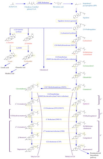 Schematic diagram of the biosynthetic pathway of plant sterols in higher plants [,,] with a special emphasis on sterols found in olive oil, showing the main structures of 4-desmethylsterols (violet), as well as 4-methyl (green) and 4,4′-dimethylsterols (red) as their biogenetic precursors. Parallel pathways of the synthesis of cholesterol and triterpene diols erythrodiol and uvaol are also shown. Dashed arrows represent several enzymatic steps not shown.