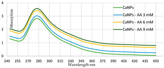 The UV-visible absorption spectra of the structure of calcium nanoparticles (CaNPs) mixed with various combinations of ascorbic acid (0, 3, 6, and 9 mM), displaying a peak at 282 nm.