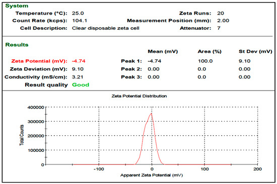 The Zeta Potential test was used to determine the nanoparticles’ (NPs) surface state and forecast the nanoparticle solution’s long-term stability. The technique was used to define the CaNPs blended with ascorbic acid (AA) surface charge at the Central Laboratory, Electron Microscope Unit, Faculty of Agriculture, Mansoura University, Mansoura, Egypt, using Malvern Instruments Ltd. and Zeta Potential Ver. 2.3. The CaNP–AA mixture has an electrical charge on its surface, attracting a thin layer of ions with opposite directions to the surface. The Zeta Potential of nanoparticles provides information about their properties. Nanoparticles have two layers of ions that move as the solution diffuses. The electric potential at the end of the double layer is referred to as the Zeta Potential of the particles, and it varies between +100 and 100 mV. CaNPs containing AA were synthesized and had a Zeta Potential of −4.74 mV (higher stability). NPs with Zeta Potentials greater than or equal to +25 mV had a high degree of stability (Figure 2).