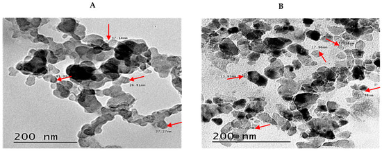 The nanoparticles’ characterization was determined using transmission electron microscopy (JEOL TEM-2100) coupled to a CCD camera at a 200 kV acceleration voltage. Nanoparticles were defined according to size, shape, surface area, particle structure, and morphological characteristics. The integrated metal nanoparticles were created by suspending them on copper-coated carbon networks and allowing the dissolvable to dissolve gradually before chronicling the TEM images. TEM measurements were taken at Mansoura University’s Central Laboratory, Electron Microscope Unit, Faculty of Agriculture, Mansoura, Egypt (Figure 3).