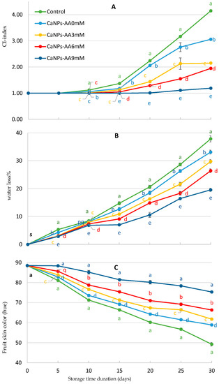 The experiment was conducted during two growth seasons (2018–2019) using the Co-Stat software package (Ver. 6.303; 789 Lighthouse Ave PMB 320, Monterey, CA 93940, USA). The chilling injury, water loss, and peach skin color profile were analyzed in a randomized complete block design for the effect of fruit color maturity stages (applied to the same fruit throughout the storage period). A factorial analysis displayed the main comparisons and the interaction effect of storage time and CaNP–AA under refrigeration. The appropriate significant differences among CaNP–AA treatments were tested by utilizing Duncan’s multiple range test at the 5% level.