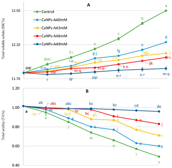 Figure 5 depicts the differentiation in chemical quality, i.e., SSC%, TA%, and SSC/TA ratio, as a function of storage duration in days for ‘Florida Prince’ peach. Evidently, SSC% increased significantly in the control fruit during the storage period. However, the CaNP–AA at 9 mM treatments presented a different trend. We observed the lowest changes in SSC% compared to untreated and treated fruit. The chemical quality elements revealed a significant interaction (p < 0.001) when storage time (days) and CaNP–AA treatments were examined.