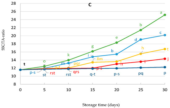 2.5. Total Soluble Solid Content (SSC%), Total Acidity (TA%), and SSC/TA Ratio