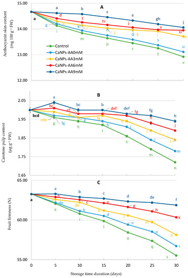 Fruit pigments (i.e., anthocyanin (A) and carotene (B)) and fruit firmness (C) of ‘Florida Prince’ peaches immersed in CaNPs mixed with ascorbic acid at different concentrations (0, 3, 6, and 9 mM) and stored at a low temperature (4 °C and 95% RH) for 30 days. Error bars represent standard errors and different letters indicate significant differences at p ≤ 0.05 among treatments for each storage period.