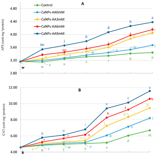 Figure 7 displays the antioxidant enzyme activities (AEAs) as a function of storage time in weeks. Apparently, the AEAs displayed a significant interaction at 5% when the CaNP–AA treatments and storage time duration (days) were considered as an experimental factor.