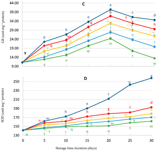 The AEAs, such as APX (A), CAT (B), GR (C), and SOD (D), of ‘Florida Prince’ peaches immersed in CaNPs mixed with ascorbic acid at different concentrations (0, 3, 6, and 9 mM) and stored at a low temperature (4 °C and 95% RH) for 30 days. Error bars represent standard errors and different letters indicate significant differences at p ≤ 0.05 among treatments for each storage period.